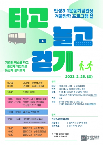 [금요저널] 안성3.1운동기념관은 겨울방학을 맞이한 학생들에게 다채로운 체험 학습 기회를 제공하는 방학 특별 교육 프로그램 “타고 놀고 걷기”의 참여자를 모집한다.