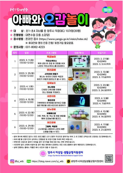 [금요저널] 양주시여성일·생활균형지원센터는 오는 27일부터 아빠와 자녀의 관계회복을 지원하는 가족친화프로그램‘아빠와 오감놀이’에 참여할 직장 아빠와 자녀를 선착순 모집한다고 밝혔다.