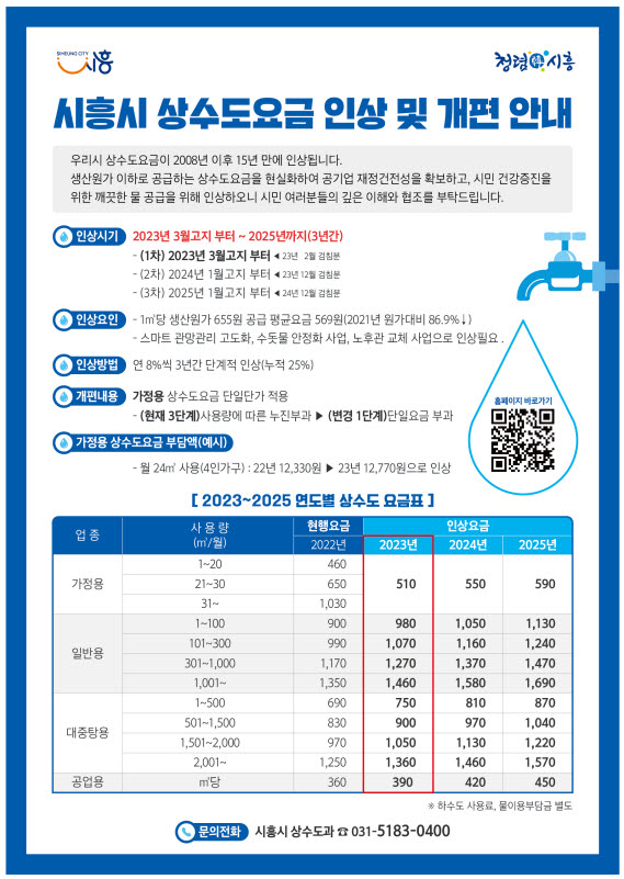 이는 가정용 4인 가구가 월평균 24㎥ 사용할 경우 현재 약 12,330원인 상수도요금이 올해 3월부터 12,770원, 2024년엔 13,730원, 2025년엔 14,690원으로 인상되면서 3년간 총 월 2,360원이 증가될 것으로 보인다.