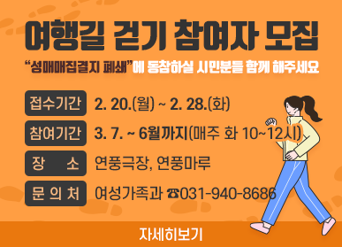 여행길 걷기는 성매매집결지 폐쇄에 대한 시민의 참여로 성평등 인식과 문화를 확산하고자 성매매 예방 교육과 연풍리에 소재한 성매매집결지를 걸어보는 프로그램으로 3월부터 6월까지 매주 화요일 오전에 진행될 예정이다.
