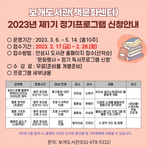 안성시, 보개도서관 책문화센터 2023년 제1기 정기 프로그램 수강생 모집