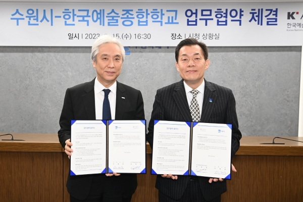 [금요저널] 수원시와 한국예술종합학교는 15일 수원시청 상황실에서 업무협약을 체결하고 문화예술 분야 교류를 활성화하기로 했다.