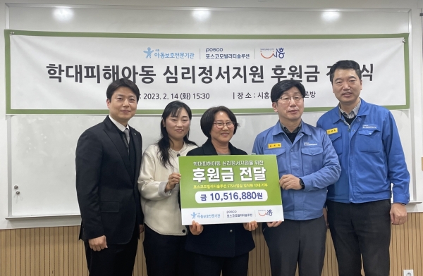 임지암 STS사업실장은 “시흥시 ESG민관협력을 통해 인연을 맺은 이후, 임직원의 기부를 통해 다시 한 번 지역사회에 도움을 줄 수 있어 뜻깊다” 며 “특히 학대 피해 아동 심리치료사업에 포스코모빌리티솔루션이 함께함으로써 미래세대 아동들이 건강하게 성장하는 데 힘을 보탤 수 있게 돼 기쁘다”고 전했다.