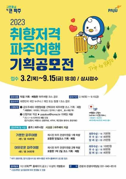 공모 분야는 가뿐한 파주여행 여유로운 파주여행 등 두 가지 주제를 진행하며 시민이 직접 기획하고 체험한 파주여행 코스를 대상으로 한다.