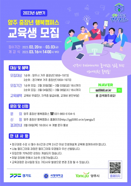 [금요저널] 양주시는‘양주 중장년 행복캠퍼스’에서 오는 20일부터 3월 3일까지 양주시 중장년의 재도약과 노년기 준비를 위해 ‘2023년 양주 중장년 행복캠퍼스 상반기 정규과정’에 참여할 교육생을 모집한다고 밝혔다.