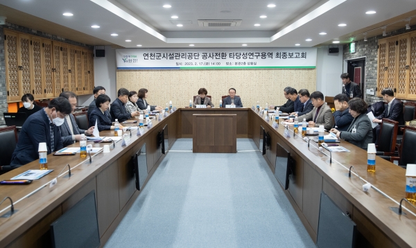 [금요저널] 연천군은 17일 군청 본관 2층 상황실에서 김덕현 군수, 심상금 연천군의회 의장, 송승원 연천군시설관리공단 이사장 등이 참석한 가운데 ‘연천군시설관리공단 공사 전환 타당성 연구용역 최종보고회’를 개최했다.