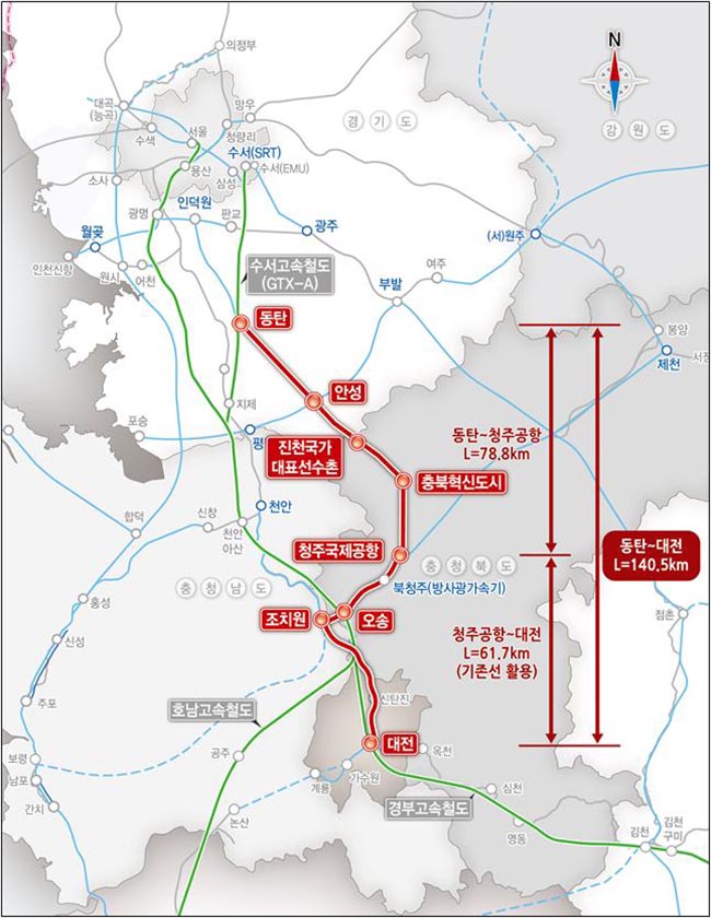 안성시를 중심으로 동탄~안성~진천~청주공항 노선은 화성 동탄역을 시작으로 안성시, 진천군을 거쳐 청주국제공항을 잇는 연장 78.8km, 사업비 약 2조 3,000억 원이 소요되는 단선철도이다.