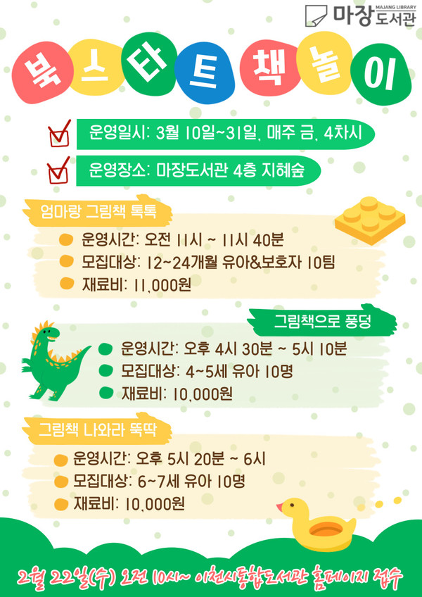 이천시립마장도서관은 ‘책과 함께 인생을 시작하자’는 북스타트 운동의 일환인 ‘2023년 북스타트 책놀이 프로그램’을 오는 3월 한 달동안 운영한다.
