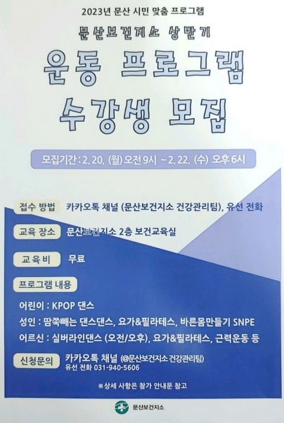 문산보건지소 관계자는 “3월부터 시작하는 문산보건지소 운동프로그램을 통해 시민들이 규칙적이고 지속적으로 신체활동량을 증가시켜 건강한 삶을 유지하기를 바란다”고 말했다.