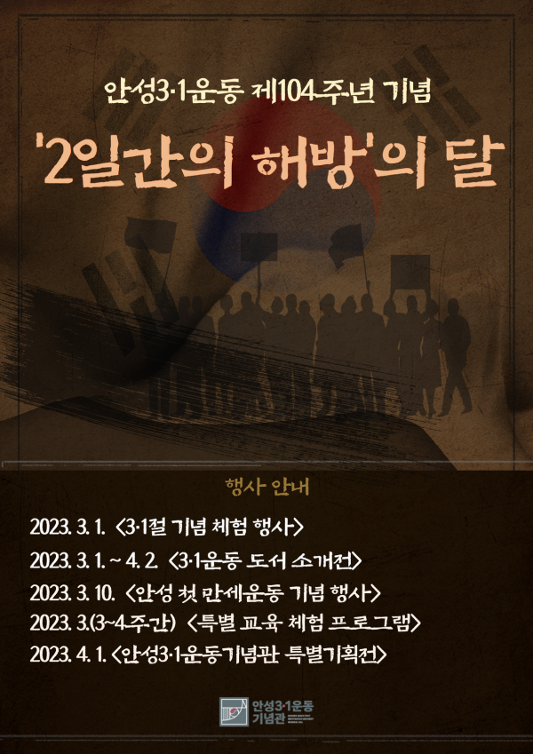 [금요저널] 안성 3.1운동 제104주년 기념해 안성 독립운동의 현장인 안성3.1운동기념관은 3월을 ‘2일간의 해방’의 달로 명명하고 다음달 1일부터 4월 2일까지 다양한 장소에서 시민들과 함께하는 다채로운 행사를 진행한다.