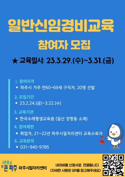 [금요저널] 파주시는 오는 24일부터 3월 22일까지 시니어 구직자들을 대상으로 2023년 ‘일반경비신임교육 프로그램’ 참여자 20명을 모집한다고 밝혔다.