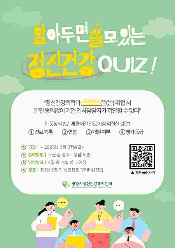 [금요저널] 광명시 정신건강복지센터는 오는 3월 말까지, 시민들을 대상으로 온라인 정신건강 인식개선 캠페인 ‘알아두면 쓸모있는 정신건강 퀴즈’를 진행한다.