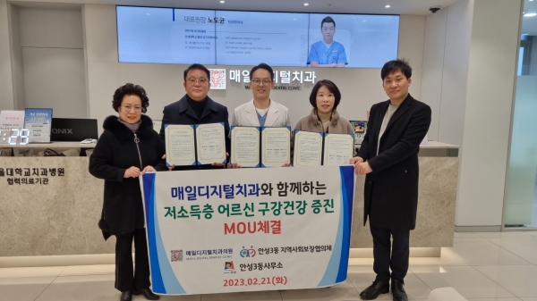 [금요저널] 안성시 안성3동주민센터와 안성3동지역사회보장협의체, 매일디지털치과의원 은 지난 2월 21일 “저소득층 어르신 구강건강 증진” 관련 활동을 명시한 업무협약을 체결했다.