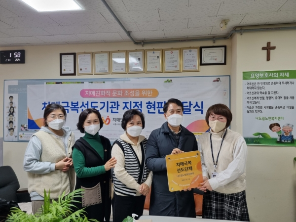 [금요저널] 시흥시는 지난 21일 치매안심마을인 월곶동 나드림노인복지센터를 치매극복 선도단체로 지정하고 현판을 전달했다.