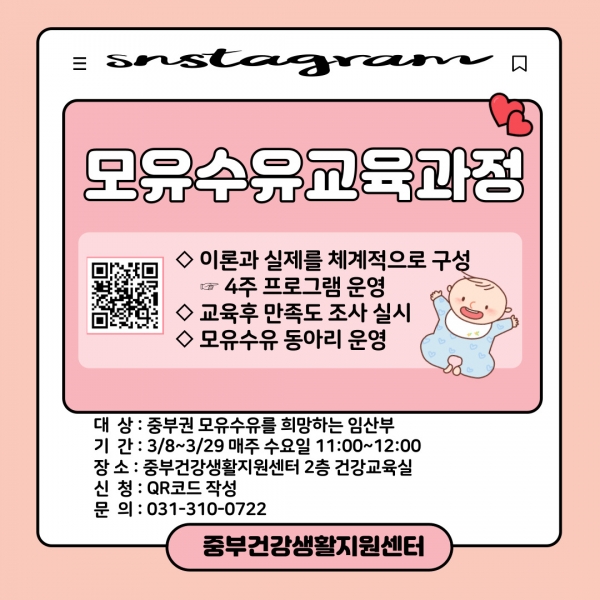 모유수유 교육과정은 안내 포스터의 QR코드를 연계한 네이버 폼 신청서 작성을 통해 접수할 수 있다.