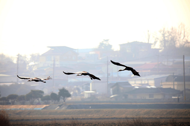 지난 5일 오전 8시 58분 “미양면 후평리 (미양)농협 저온창고 부근 두루미 포착”이라는 문자 메시지와 함께 논배미에서 먹이 활동을 하는 3마리의 재두루미 사진을 마을 주민이자 농민인 이훈씨가 제보해 왔다.