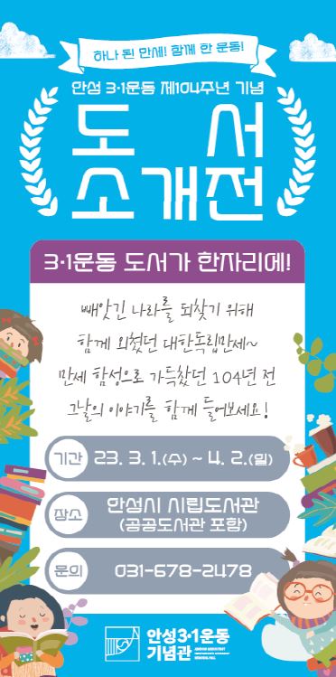 이러한 안성의 3.1운동, 독립운동 이야기와 자료를 담은 도서들을 4월 2일까지 시립중앙도서관과 일죽·보개·아양·공도·진사도서관의 종합자료실과 어린이자료실에서 만나볼 수 있으며 최근에 안성3.1운동기념관에서 발간한 ‘‘2일간의 해방’ 안성독립운동역사마을 이야기’ 점자 그림책이 이번 도서 소개전에서 첫선을 보일 예정이다.