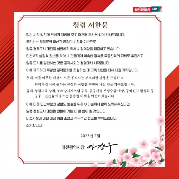 서한문에는 “대전시 모든 공직자의 부조리한 관행을 근절한다”는 메시지와 함께 청렴교육 강화와 부패방지시스템 구축, 공익신고활성화 등 공공과 민간을 아우르는 촘촘한 대책을 마련한다는 확고한 의지를 담는 등 일류 청렴도시 대전을 만들어 가는데 함께 노력해 달라”고 당부했다.