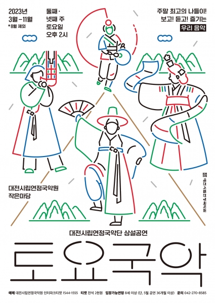 토요국악은 평일 공연을 즐기기 어려운 시민들에게 주말에 다양한 국악 프로그램을 쉽고 재미있게 접할 수 있도록 대전시립연정국악단에서 지속적으로 운영하고 있는 상설공연이다.