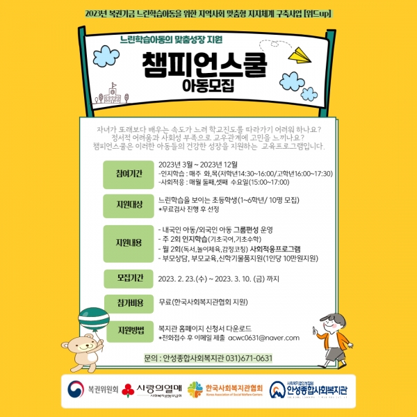 [금요저널] 안성종합사회복지관에서는 복권위원회 후원, 사회복지공동모금회의 지원을 받아 2023년 복권기금 느린학습 아동을 위한 지역사회 맞춤형 지지체계 구축사업‘위드up’‘챔피언스쿨’의 참여 아동을 2월 23일부터 3월 10일까지 모집한다.