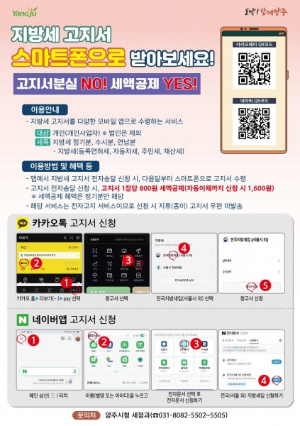 [금요저널] 양주시는 스마트폰으로 간편하게 지방세 고지서를 받고 납부 할 수 있는 ‘지방세 전자송달 서비스’를 적극 홍보에 나섰다.