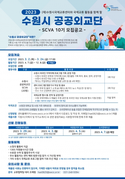 [금요저널] 수원시국제교류센터는 ‘2023 수원시 공공외교단 10기’로 활동할 대학생 20명을 3월 24일 오후 5시까지 모집한다.