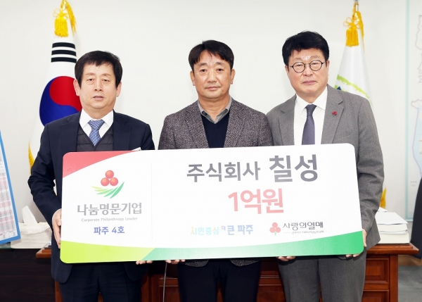 김진기 파주시 부시장은 “어려운 경제 상황 속에서도 지역사회 성장과 이웃사랑을 실천해준 ㈜칠성에 감사드린다”며 “앞으로도 시민들을 위한 신속하고 효율적인 행정과 나눔 복지 실현을 위해 최선을 다하겠다”고 전했다.