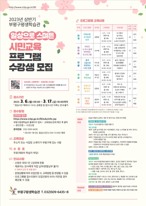 주소지 또는 사업장 소재지가 부평구인 주민은 부평구 평생학습관 누리집에서 수강 신청할 수 있으며 모집은 선착순으로 마감한다.