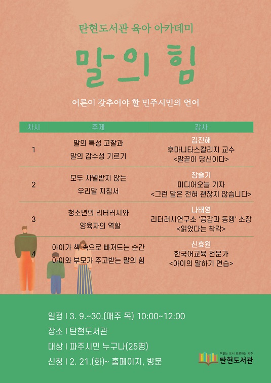 [금요저널] 파주시 탄현도서관이 3월 9일부터 30일까지 매주 목요일 총 4회에 걸쳐 육아 아카데미 ‘말의 힘’을 운영한다.