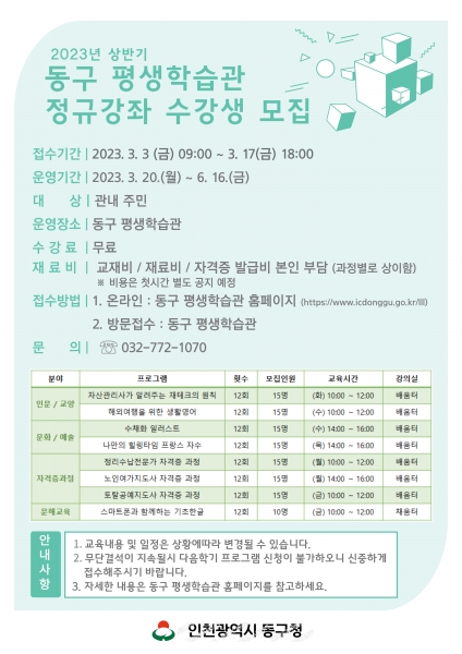 인천 동구 평생학습관, 상반기 정규강좌 수강생 모집