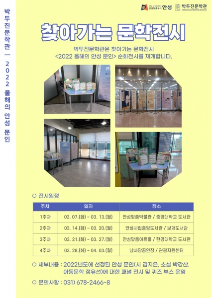 ‘찾아가는 문학전시’는 지난 2022년 안성 문학 진흥사업에서 선정한 ‘올해의 안성 문인’ 홍보 전시이며 구체적인 전시 장소 및 일정은 안성맞춤박물관·중앙대학교도서관 안성시립중앙도서관·보개도서관 안성맞춤아트홀·한경대학교도서관 남사당공연장·안성시 관광지원센터 순이다.
