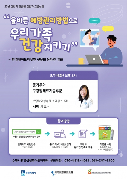 [금요저널] 수원시환경성질환아토피센터는 ‘2023년 제2회 맞춤형 질환자 그룹상담’과 ‘2023년 제2회 환경보건 공개강좌’를 온라인으로 연다.