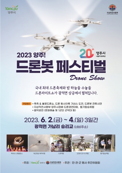 [금요저널] 양주시는 올해로 3회째를 맞은 ‘2023 양주 드론봇 페스티벌’에서 전시·체험부스를 운영할 공공기관·민간기업·단체를 오는 20일까지 모집한다고 밝혔다.