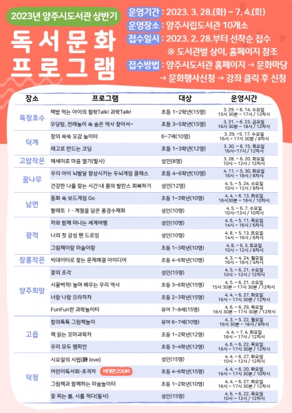 [금요저널] 양주시도서관은 시민에게 독서문화 향유의 기회를 제공하기 위해 오는 28일부터 3개월간 ‘2023년 상반기 독서문화 프로그램’에 참여할 수강생을 모집한다.
