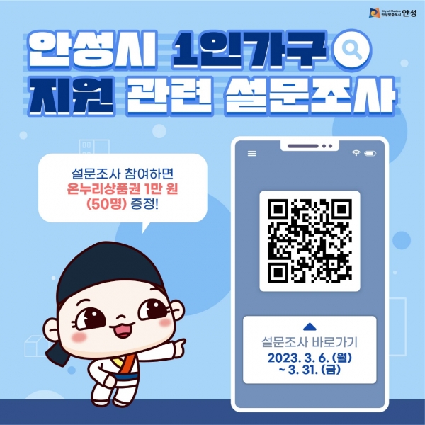 설문조사는 현재 1인가구 뿐만 아니라 ‘누구나 생애주기 중 한번은 1인가구일 수 있다’는 가정으로 안성시 거주 시민은 누구나 설문에 참여하도록 했고 참여방법은 온·오프라인으로 홈페이지, 블로그, 읍면동사무소를 통해 참여할 수 있으며 온라인 참여자는 추첨을 통해 온누리상품권을 지급할 예정이다.
