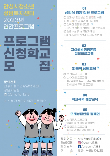[금요저널] 안성시청소년상담복지센터는 지난 2월 28일부터 안성관내 청소년 대상 위기청소년 예방교육 및 또래상담연합 캠페인 참여 학교 모집을 시작했다.