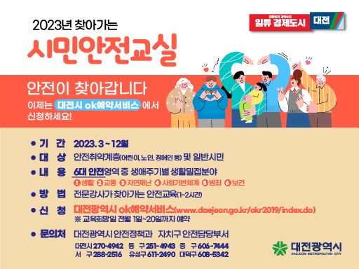 [금요저널] 대전시는 8일부터 어린이, 노인, 장애인 등 안전취약계층과 일반시민을 대상으로 ‘2023년 찾아가는 시민안전교실’을 운영한다고 밝혔다.