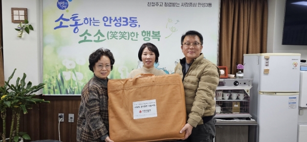 [금요저널] 안성시 안성3동지역사회보장협의체는 지난 2월 주택도시보증공사와 부산사회복지공동모금회가 주관한 ‘2023 연말연시 사회복지 배분 공모사업’에 선정되어 3월 7일 안성3동 관내 취약계층에 전기장판 20개를 전달했다.