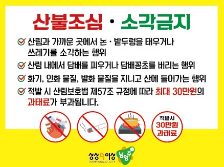 한편 산불 조심 기간에는 산림으로부터 100m 이내 토지에서 소각 행위를 전면 금지하고 있으며 이를 위반할 경우 30만원의 과태료가 부과된다.