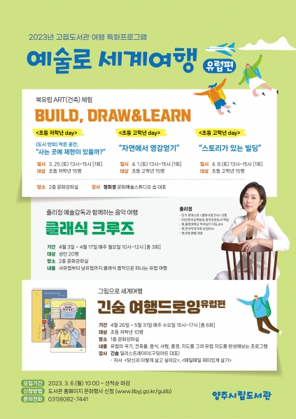 [금요저널] 양주시 고읍도서관이 음악, 건축, 미술로 세계를 여행해 보는 여행 특화 프로그램 ‘예술로 세계여행: 유럽편’수강생을 모집한다.
