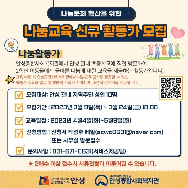 [금요저널] 안성종합사회복지관에서는 안성시 평생학습 우수 프로그램 지원사업으로서 안성시에서 지원을 받아 지역 사회 내 나눔문화 확산을 위한 2023년 나눔교육 신규활동가를 3월24일까지 모집한다.