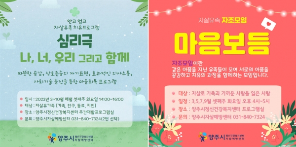 [금요저널] 양주시자살예방센터는 오는 10월까지 자살 유족 치유프로그램 ‘안고 업고’와 자조모임 ‘마음보듬’을 진행한다.