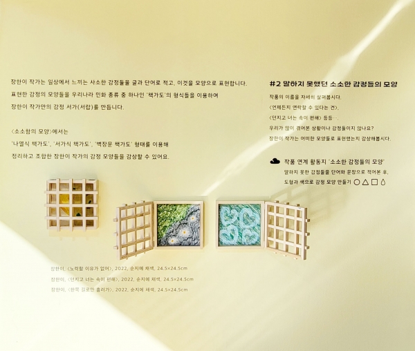 관람객들은 작품과 연계해 민화 책가도의 모양과 같은 ‘감정 책가도 서랍’에 나만의 감정 모형을 배치하고 표현하는 활동에 참여할 수 있다.