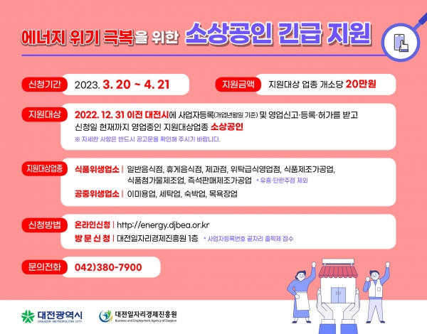 대전시 김영빈 경제과학국장은 “지역 소상공인분들을 위한 긴급 지원인 만큼 전기·가스요금 인상으로 어려움을 겪고 계신 분들께 조금이나마 도움이 되시기를 바란다”고 말하며 “이번 지원에서 누락되지 않토록 식품·공중위생업소를 운영중인 소상공인 분들은 신청기한 내에 꼭 신청해 달라”고 당부했다.