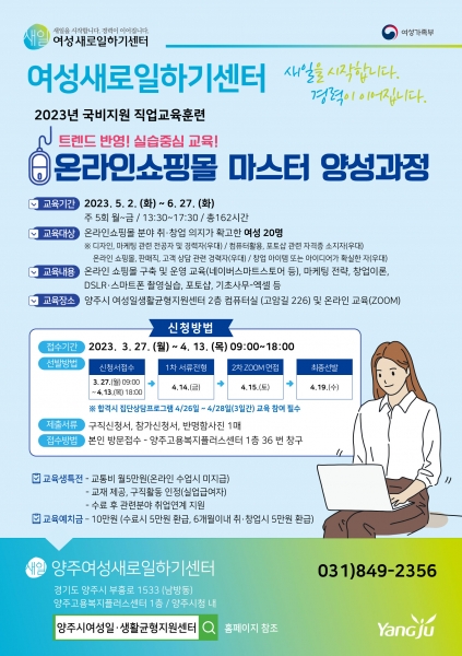 [금요저널] 양주여성새로일하기센터는 오는 27일부터 4월 13일까지 직업교육훈련 ‘온라인 쇼핑몰 마스터 양성과정’ 교육생을 모집한다.