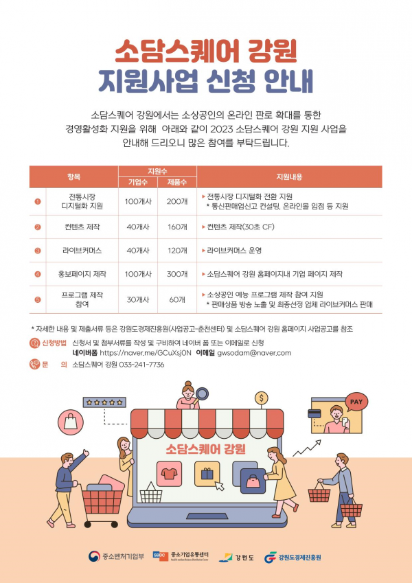 [금요저널] 강원도는 중소벤처기업부 산하기관 중소기업유통센터 및 강원도경제진흥원과 함께 2023년 3월 17일부터 4월 5일까지 소상공인 디지털전환 및 온라인 판로지원을 위한‘2023 소담스퀘어 강원 지원사업’참여업체 모집을 실시한다고 밝혔다.