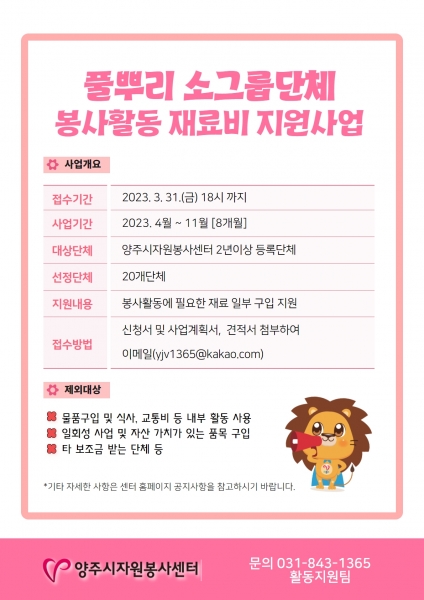 참여를 희망하는 단체는 오는 31일까지 양주시자원봉사센터 홈페이지에서 신청서를 내려받아 센터로 직접 방문하거나 이메일로 제출하고 자세한 사항은 양주시자원봉사센터 활동지원팀으로 문의하면 된다.