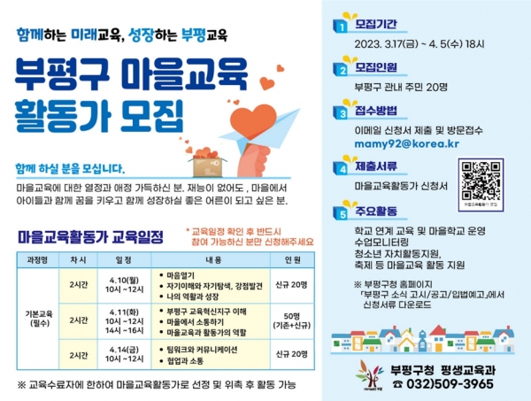 모집대상은 마을 교육 활동에 관심과 열정이 있는 부평구 주민 20명이다.