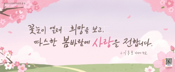 [금요저널] 수원시가 2023년 수원희망글판 봄편 문안 ‘꽃눈이 열려 희망을 보고 따스한 봄바람에 사랑을 전한다’를 5월까지 수원시 곳곳과 수원시 유튜브 채널에 게시한다.