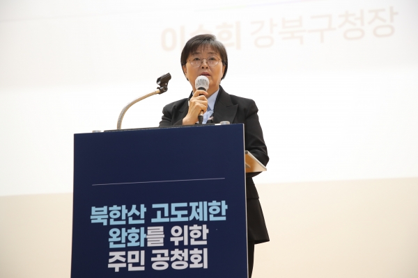 [금요저널] 이순희 서울 강북구청장이 지난 17일 한신대학교에서 열린 ‘북한산 고도제한 완화를 위한 주민공청회’에 참석해 그간의 경과를 설명하고 구민 의견을 경청했다.
